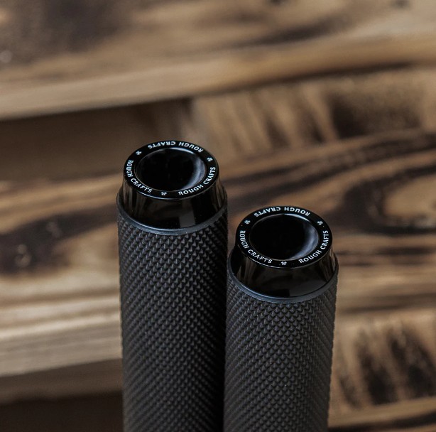 CNC加工されたビレットエンドキャップ、鍛造された内部構造、ラバー部分は滑り止めのナール模様付です。