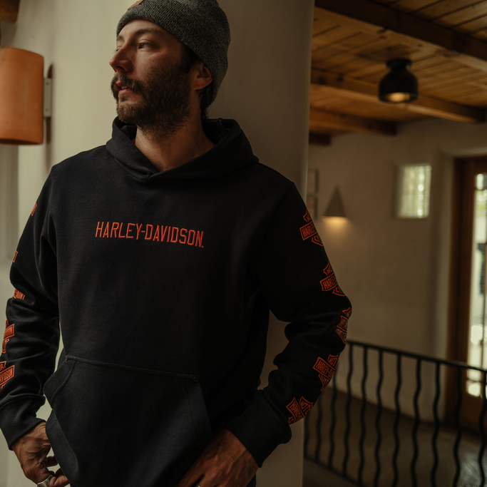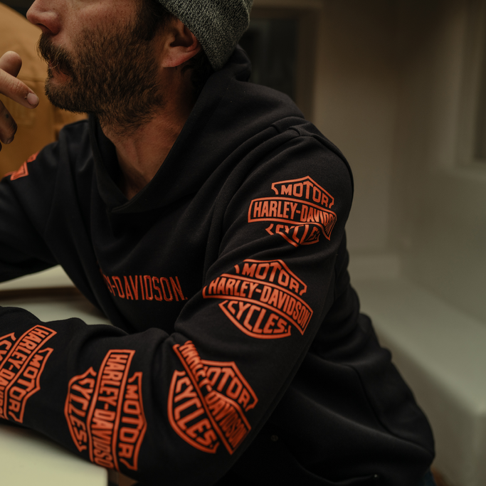 フロントにはハーレーダビッドソンのネーム刺繍、両袖にはハーレーダビッドソンの代表的なグラフィックをプリントであしらっています。