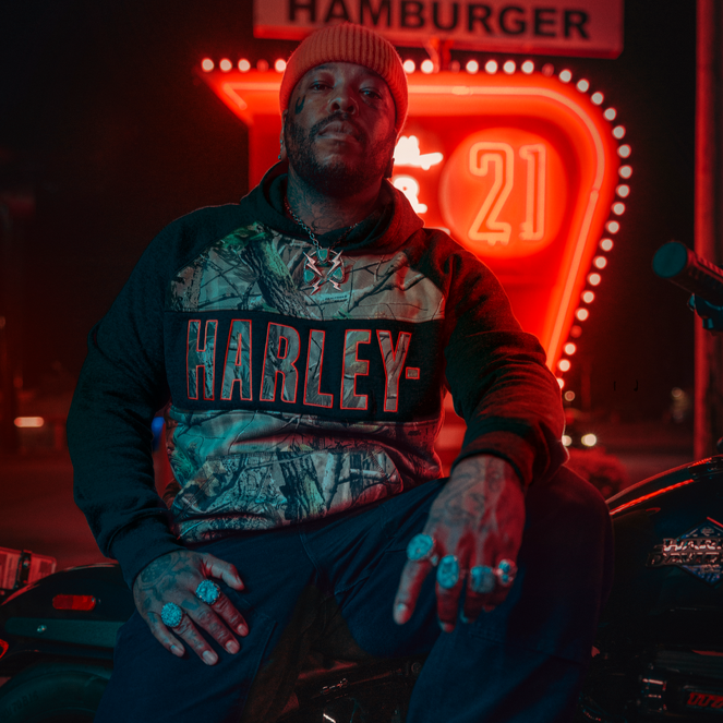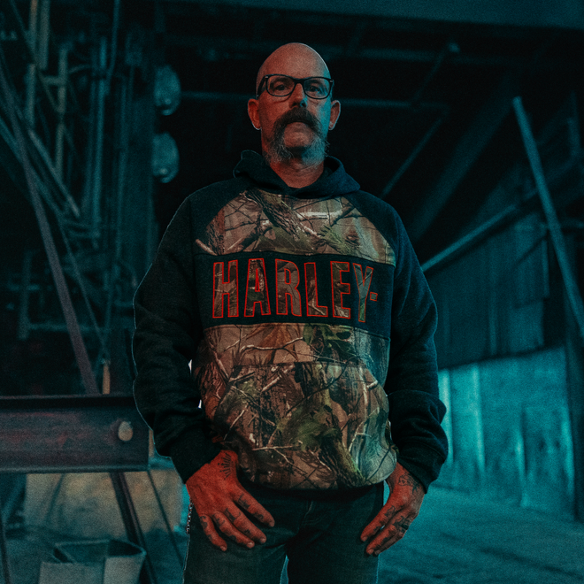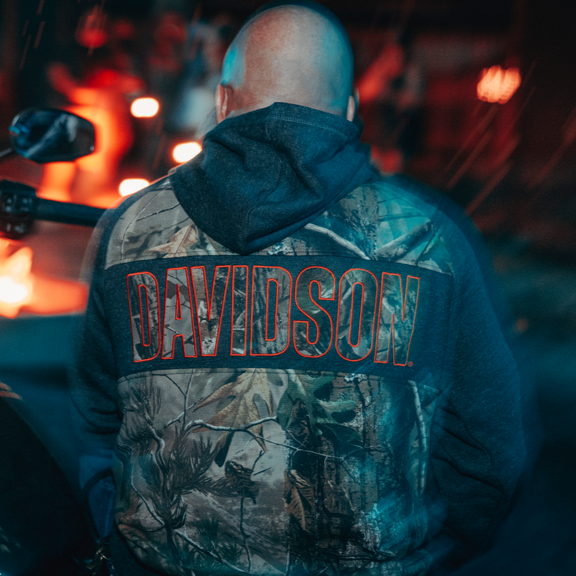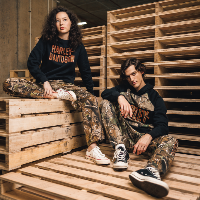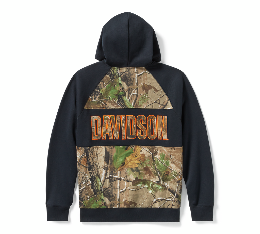 ハーレーダビッドソンのグラフィックとRealtree APGパターンを配したカラーブロックデザインは、広葉樹、松林、草原、川底といったアウトドアシーンを彷彿とさせます。