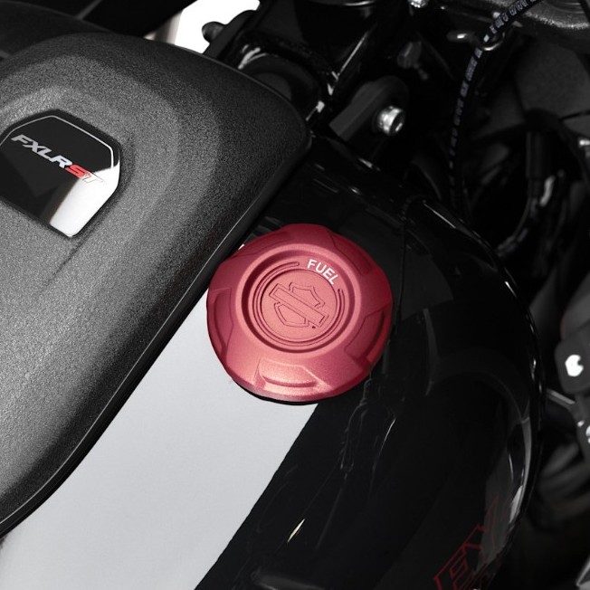 機械加工された湾曲したスポークがアグレッシブなスピード感を醸し出す、Redlineコレクションのフューエルキャップ。