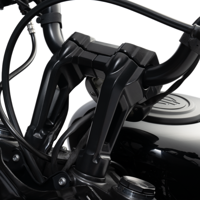 別売モト・ハンドルバー(55801558)と同時装着すれば、ハンドポジションがノーマルよりも2インチ(約5cm)アップ、1インチ(約2.5cm)手前になり、コントロールしやすく、背筋の伸びたポジションとなります。
