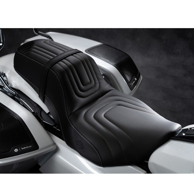 この一体型二人乗りシートは、上質な滑らかなブラックビニールレザー素材を使用し、ライダーとパッセンジャーの座面には大胆なU字型のステッチが施されています。マルチパネルデザインと全体に施されたコントラストステッチも特徴です。